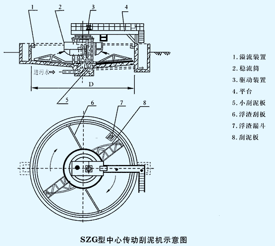 【用途與簡(jiǎn)介】 SZG型多用于輻流式沉淀池,即初次沉淀池的污泥排除的和排除浮渣。本機(jī)為中心傳動(dòng)、平臺(tái)固定支墩式,通常直徑范圍在8米至20米。小型下部采用整體對(duì)螺線刮板,中大型下部采用多板傾斜刮板,上部帶有浮渣收集裝置,池中心配水與排泥。 用戶選定型號(hào)后提供詳細(xì)土建條件圖。